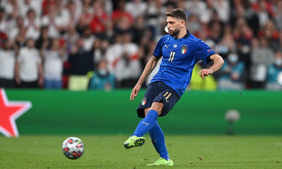 It was Mancini, though, who had changed the game with his substitutions, the introduction of Domenico Berardi for Ciro Immobile finally allowing Italy to achieve the width required to stretch England’s defence. As he hugged the right touchline, Lorenzo Insigne, operating now as a false nine, started to find space to operate inside. Bonucci’s goal arrived from a corner, but only after Italy had begun to build a head of steam.